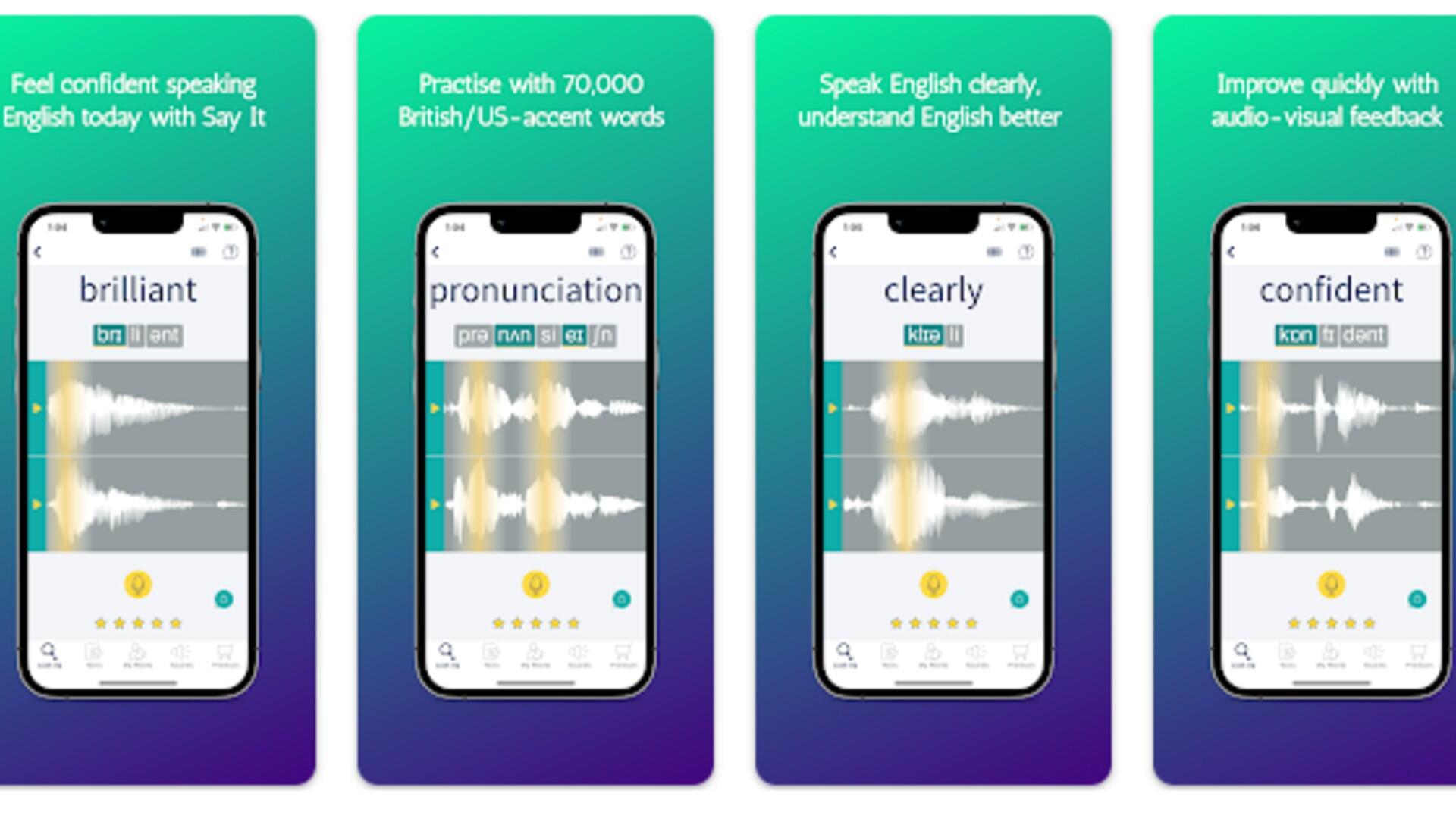 Say It se distingue de otras apps por su enfoque visual para la pronunciación. Cuando buscas una palabra, la aplicación muestra una onda de sonido (soundwave) de la pronunciación de un hablante nativo.