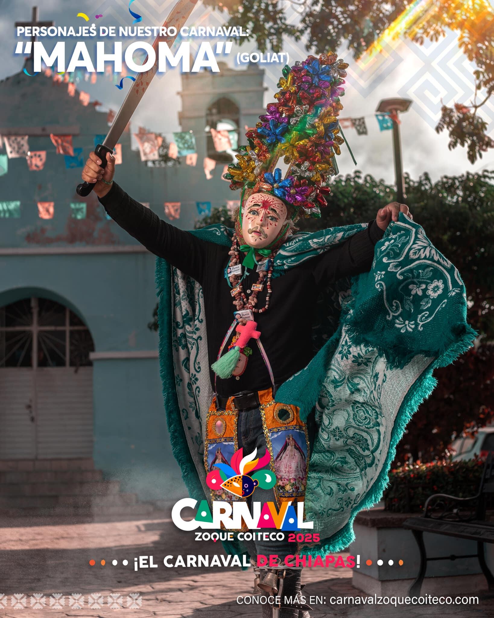 - Personajes y vestimenta llenos de simbolismo. Los personajes del carnaval, como el Mahoma, los tigres y los enmascarados, cumplen funciones específicas dentro del ritual. La vestimenta del carnaval Zoque Coiteco, elaborada de forma artesanal, destaca por sus máscaras de madera, muchos colores vivos y accesorios que acompañan el ritmo de la danza.
