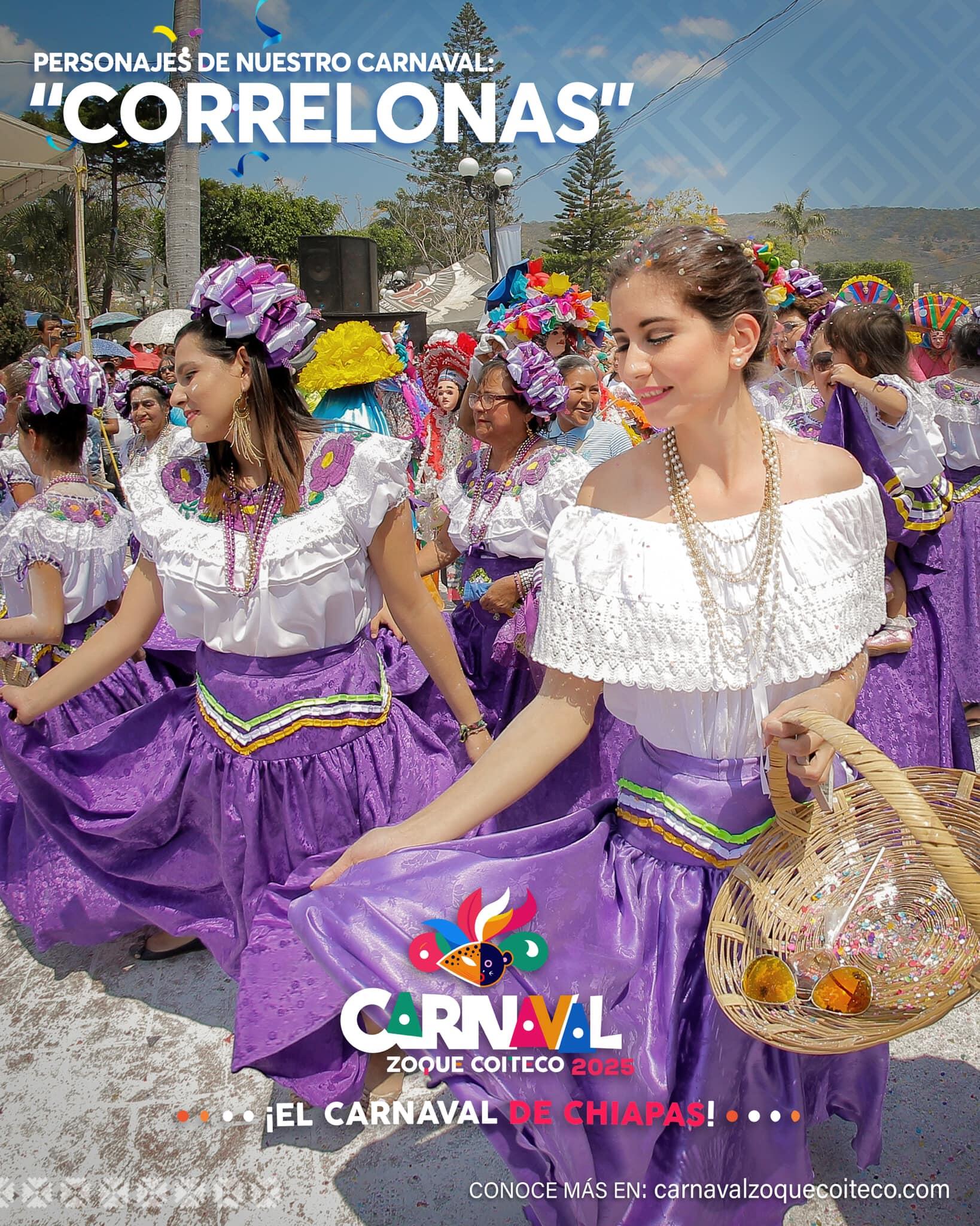- Las Correlonas: Es el nombre que se les da a las mujeres que acompañan el desfile. Se caracterizan por su vestimenta con blusas blancas (Ocozocoautlenses), peinetas y faldas de coloridos vistosos.