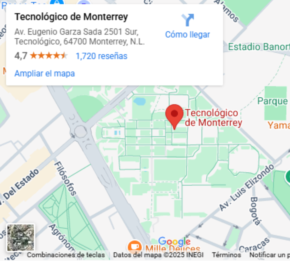 - Dirección: Av. Eugenio Garza Sada 2501 Sur Col. Tecnológico C.P. 64849, Monterrey, Nuevo León.