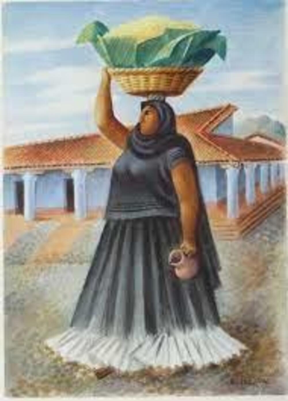 En esta obra, la protagonista lleva una cesta cargada, quizás con flores, en la cabeza, y en una mano tiene un jarrito de barro. Está parada frente a un edificio con columnas que se cree es la Casa del Cabildo de una ciudad del istmo. Covarrubias produjo muchas imágenes de tehuanas cargando flores dentro de recipientes y cestas, en varias técnicas: pintura, dibujo, e incluso xilografía.