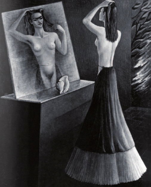 En el retrato se puede ver a Frida Kahlo semidesnuda peinando su cabello y admirando su silueta.