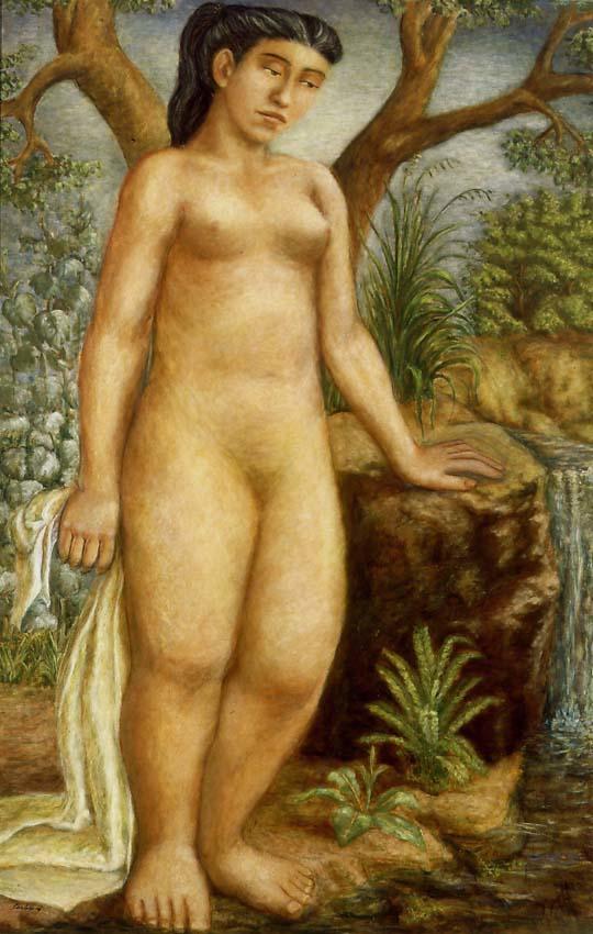 En esta obra, la artista nos muestra a una mujer desnuda que se baña en un río rodeado de vegetación.