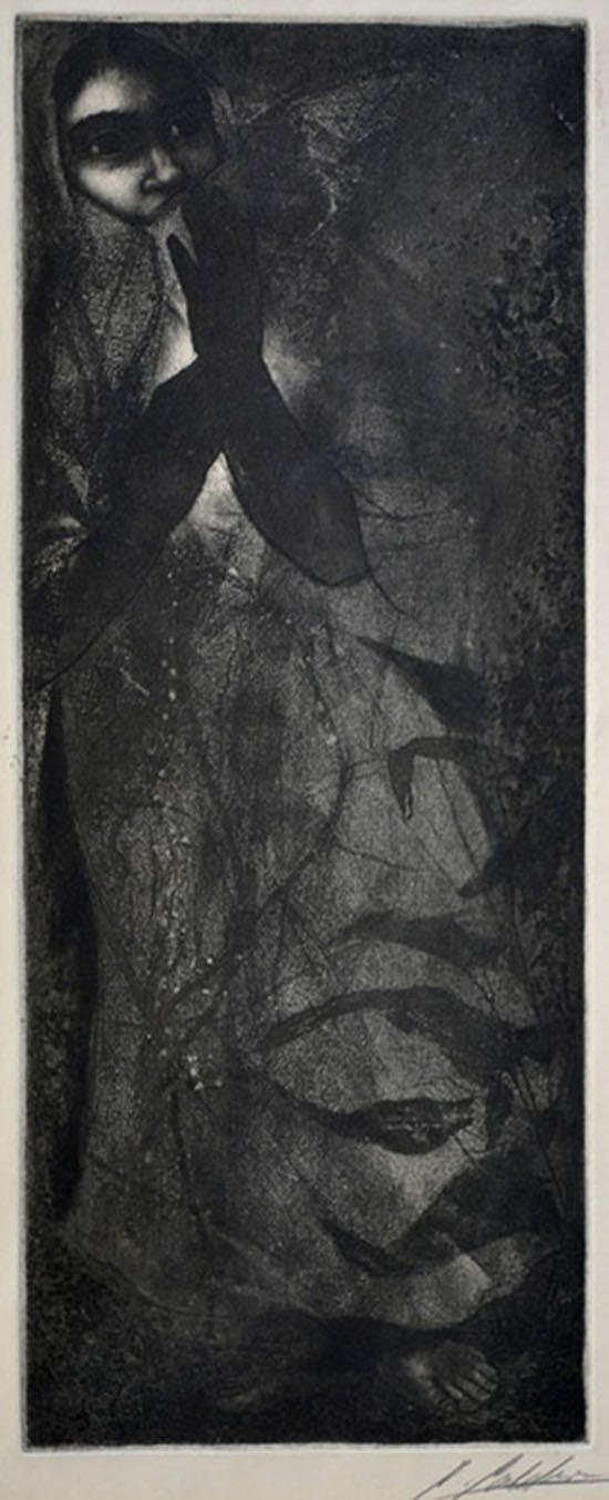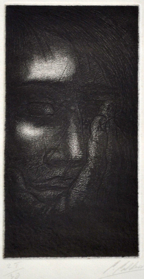 En este grabado se hace presente una vez más el sentimiento de angustia que abrumada a la artista. La imagen nos muestra un rostro dibujado en alto contraste donde las sombras lo cubren casi todo.