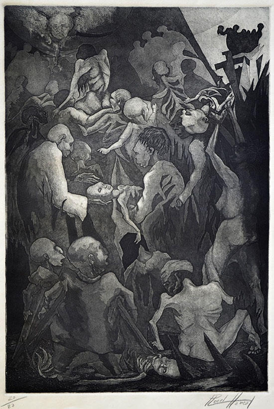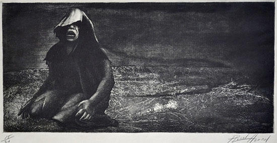 Esta obra fue realizada con la técnica de grabado, en ella podemos ver a una persona hincada con la cara semicubierta y una expresión de dolor.