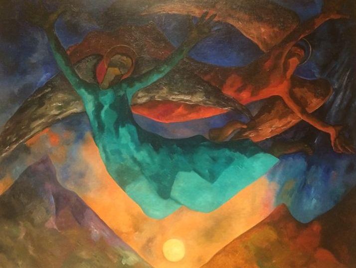 Ángeles de la noche está fechada en 1957 y es otra pintura famosa de Urueta. Representa a dos ángeles volando sobre una ciudad. Los ángeles son símbolos de esperanza y protección.