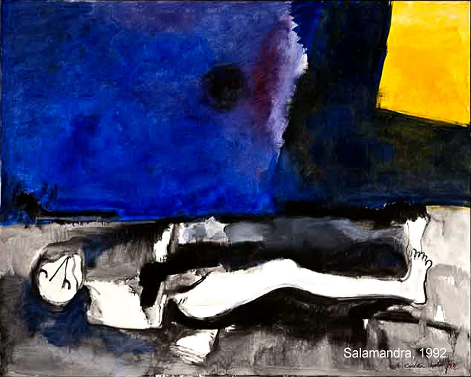 En esta obra fechada en 1990, la pintora continúa representando el infinito, la búsqueda de un camino a otra dimensión y la representación de lo intangible.