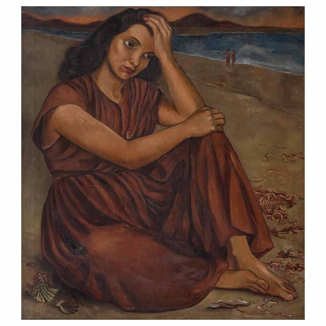 La pintura "Muchacha en la playa" de Cordelia Urueta, presenta a una joven solitaria en la orilla del mar.