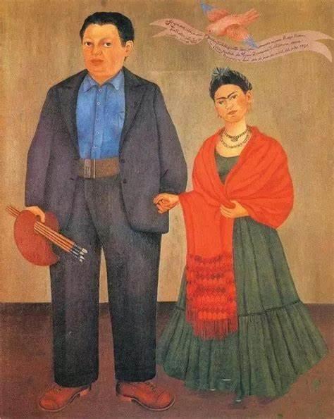 Un retrato doble que expresa la devoción de Frida por su esposo, el muralista Diego Rivera. En la pintura, Frida y Diego se muestran de pie, tomados de la mano, frente a un paisaje urbano. Frida viste un traje tradicional de tehuana, mientras que Diego lleva un traje formal.
