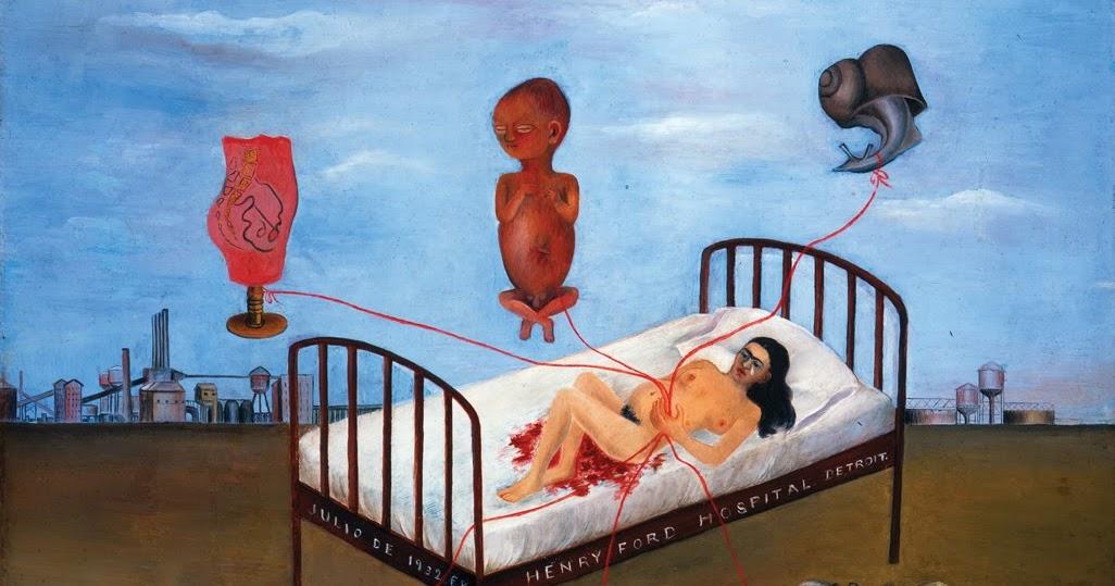 Esta pintura representa el dolor de Frida por el aborto que sufrió en Detroit, en el hospital Henry Ford, donde se ve a sí misma desnuda y rodeada de objetos simbólicos que aluden a su sufrimiento físico y emocional.