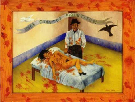 En esta pintura Frida plasmó una escena real. La obra es una representación cruda de la violencia de género, y muestra a una mujer apuñalada por su marido celoso.